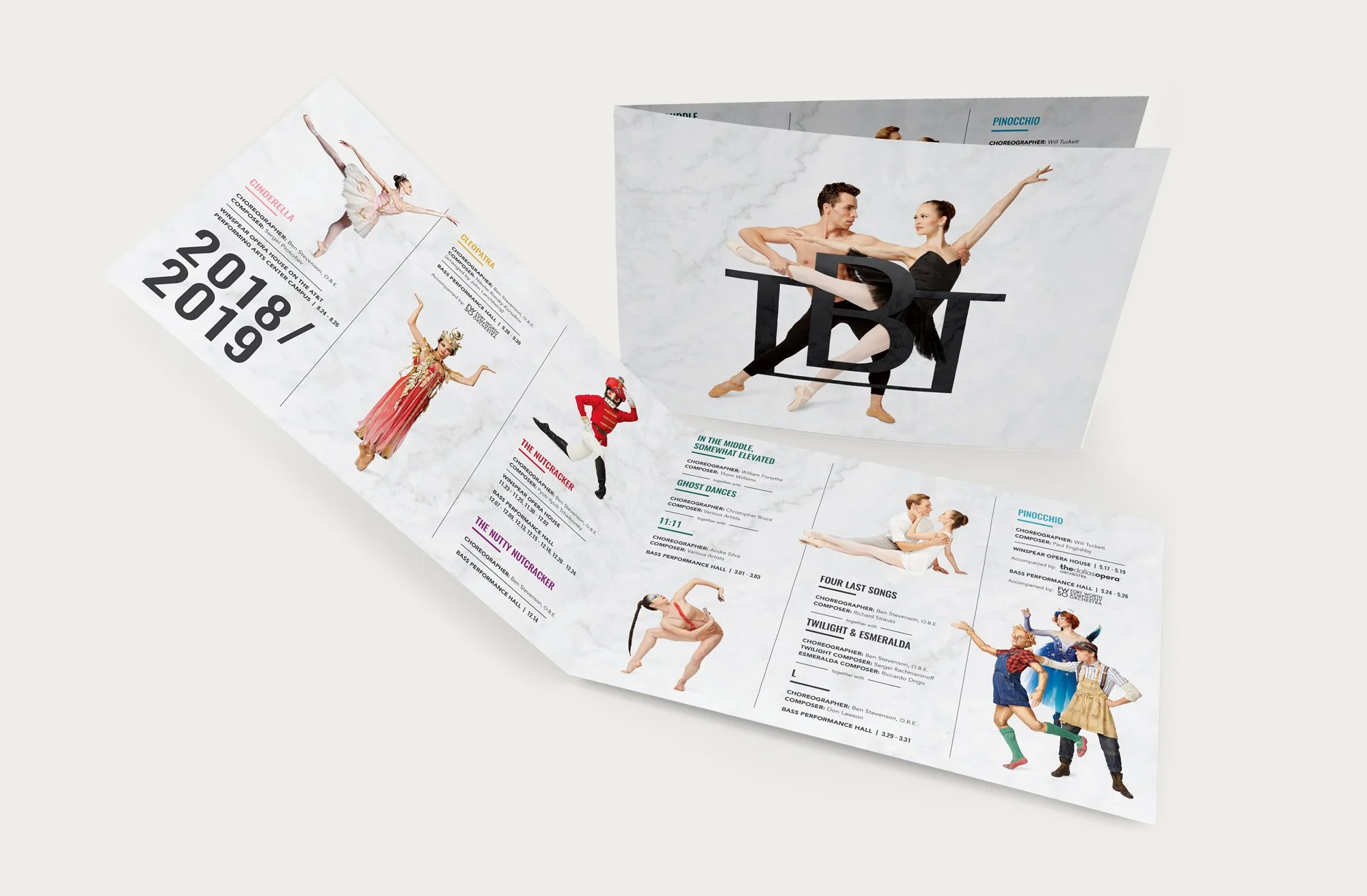 Since their founding in 1961, Texas Ballet Theater has evolved from a small regional ballet company to the internationally recognized organization it is today. They attract some of the finest dancers and choreographers to North Texas. Texas Ballet Theater originally came to us wanting to rebrand with a new logo and a new website. From there we had the opportunity to come up with a new look and feel for each new ballet season. Each new seasonal creative direction was then translated into a luxury brochure for donors, as well as a leave behind fold over piece for show attendees. After two seasons of working alongside the creative director on these pieces, I became the lead creative on projects. In addition to print pieces, I was also tasked with reskinning their website to reflect the new creative. For the 2018/2019 season, the chosen direction was dancers interacting with words that reflected the theme of each ballet, while bringing in textures and colors based on themes and costumes. I directed the photoshoot keeping in mind the layout of each hero page and how the dancers would interact with the words. Photography by the amazing Steven Visneau.
